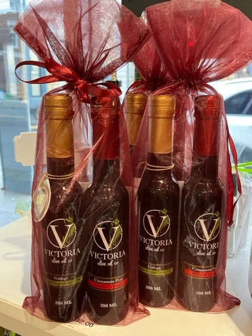 We have a large variety of different olive oils and balsamic vinegars. Our olive oils are unfiltered and come from the first crush of the green olive. All of our balsamic vinegars are from Modena, Italy. They are aged for 12+ years and are free from added sugars and preservatives. We also offer a variety of gourmet grocery items at Victoria Gourmet Food.